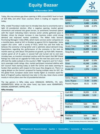 - Services sector activity in India increased in October driven by rising new orders, but the market declined due to S&P rating agency ruling out an upgrade for India for the next two years.