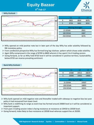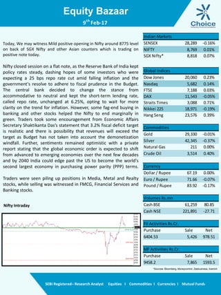 The document provides a daily market summary and outlook. It notes that the Nifty may open mildly positive due to positive Asian markets. The RBI kept policy rates steady, going against expectations of a rate cut. Some buying in banking and other stocks helped the Nifty end marginally higher. Traders were encouraged by statements on fiscal deficit targets being realistic. The outlook provides technical analysis on the Nifty and Bank Nifty, noting resistance and support levels. It provides recommendations on whether to buy or sell various stocks.