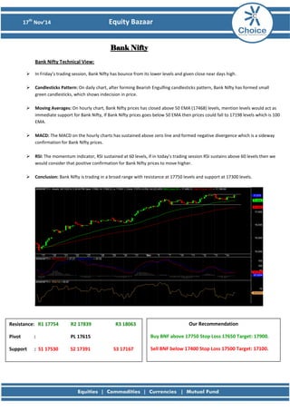 The document provides a technical analysis of the Nifty, Bank Nifty, Tata Steel, and derivative markets from November 17, 2014. It notes that the Nifty opened lower on Friday but moved higher in the second half of trading, forming an indecisive candlestick pattern. Bank Nifty bounced from lower levels. Tata Steel gave a downtrend line breakout and sustained above resistance. It provides resistance and support levels and recommendations to buy or sell various securities.