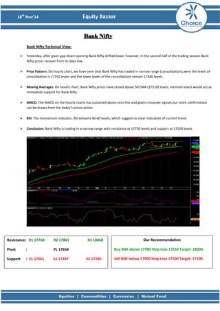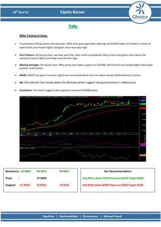 The document provides a technical analysis of the Nifty, Bank Nifty, and Crompton Greav stock. For Nifty, it notes that prices closed near the day's high after an initial drop and broke resistance. It recommends buying above 8470 with a target of 8600. For Bank Nifty, it observes consolidation between 17750 and 17480 and recommends buying above 17780 with a target of 18000. For Crompton Greav, it recommends buying above 195 based on a breakout from a downtrend and bullish candlestick pattern, with a target of 202.