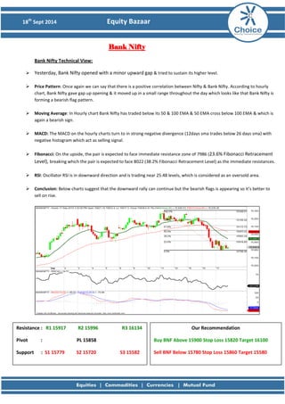 The document provides a technical analysis of the Nifty, Bank Nifty, and ABB stock from September 18th, 2014. It finds that the Nifty and Bank Nifty are in a downward trend based on indicators like the moving averages, MACD, and RSI. It recommends selling the Nifty below 7950 and the Bank Nifty below 15780. The analysis finds ABB to be in an upward trend based on positive divergences in the MACD and rising volume and recommends buying above 1236.