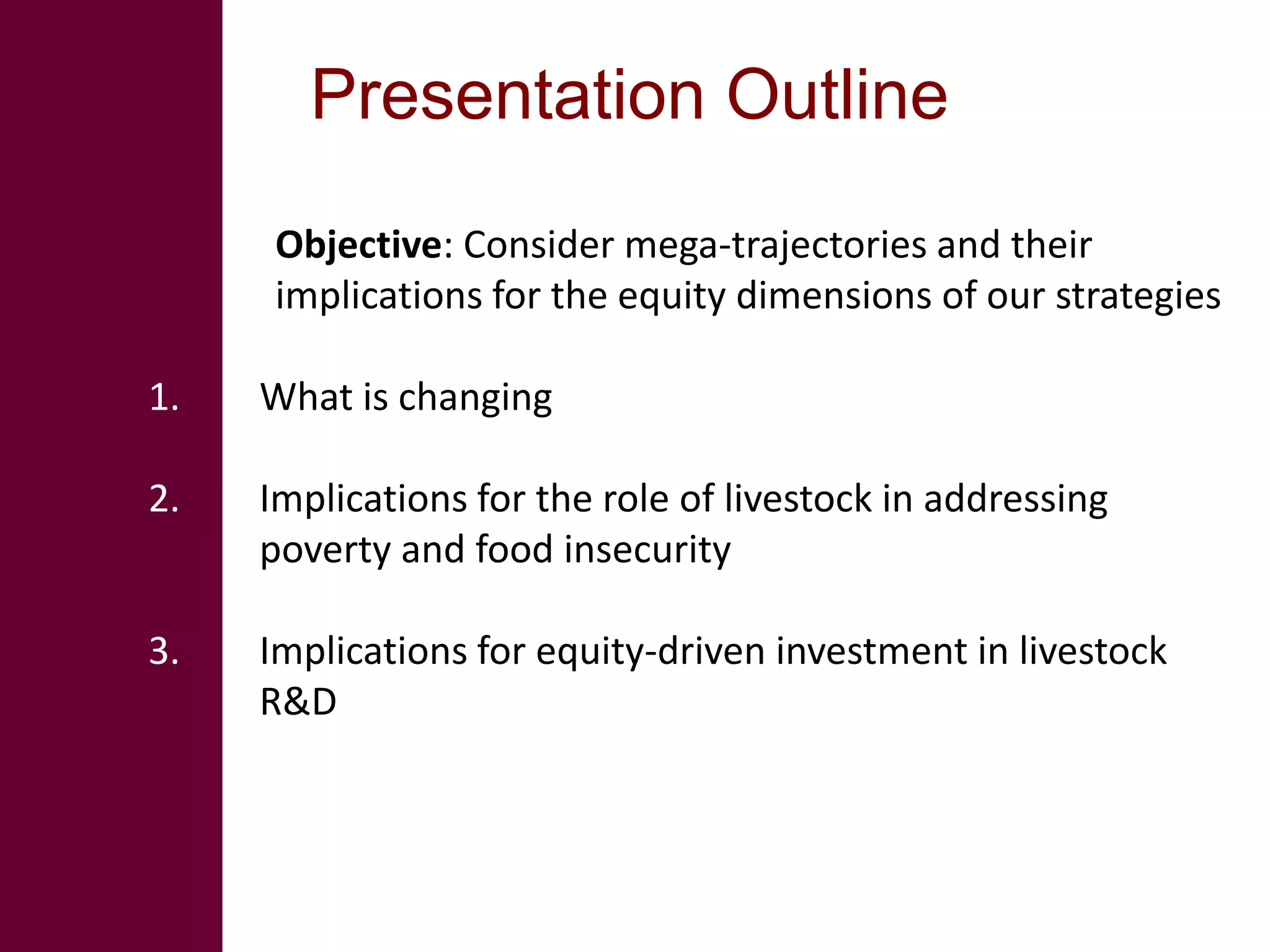 The document discusses the challenges of global poverty and food security, specifically through the lens of livestock's role in developing economies and smallholder systems. It outlines changing dynamics in demand for animal-source food, the importance of smallholder production, and the need for informed investment strategies to support both commercialization and social protection in livestock development. Overall, it emphasizes the necessity for tailored approaches to research and investment that recognize the diverse needs of smallholders and the potential trade-offs in supporting either economic empowerment or social safety nets.