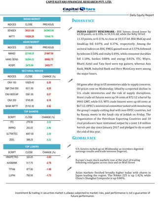 The daily equity report from Capitalstars Financial Research indicates a decline in major Indian market indices with the Sensex down by 63.38 points and Nifty 50 by 11.10 points. Top gainers included ITC and Wipro, while Hindpetro and Axis Bank were among the major losers. Additionally, global oil prices rose due to a decline in U.S. crude inventories, with OPEC ministers preparing for supply discussions.