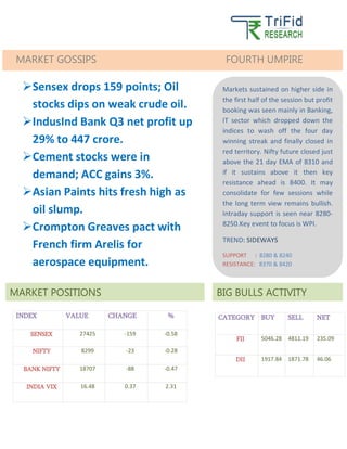 On January 14, 2015, Indian indices experienced a decline with the Sensex down by 159 points due to profit booking in banking and IT sectors. Nifty future closed above the 21-day EMA, indicating potential resistance ahead at 8400, while consolidating trends are expected in the near term. Key market activities included a notable profit increase for IndusInd Bank and demand for cement stocks.