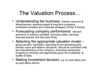 This document discusses various equity valuation approaches and methods. It begins by outlining the valuation process of understanding the business, forecasting performance, and selecting an appropriate valuation model. It then describes absolute valuation methods like discounted cash flow analysis using free cash flow to the firm (FCFF) or free cash flow to equity (FCFE). Relative valuation methods discussed include comparing price/earnings (P/E), price/book value (P/B), and enterprise value/EBITDA multiples to industry peers. The document also briefly discusses the residual income model and notes factors to consider in choosing the most appropriate valuation model.