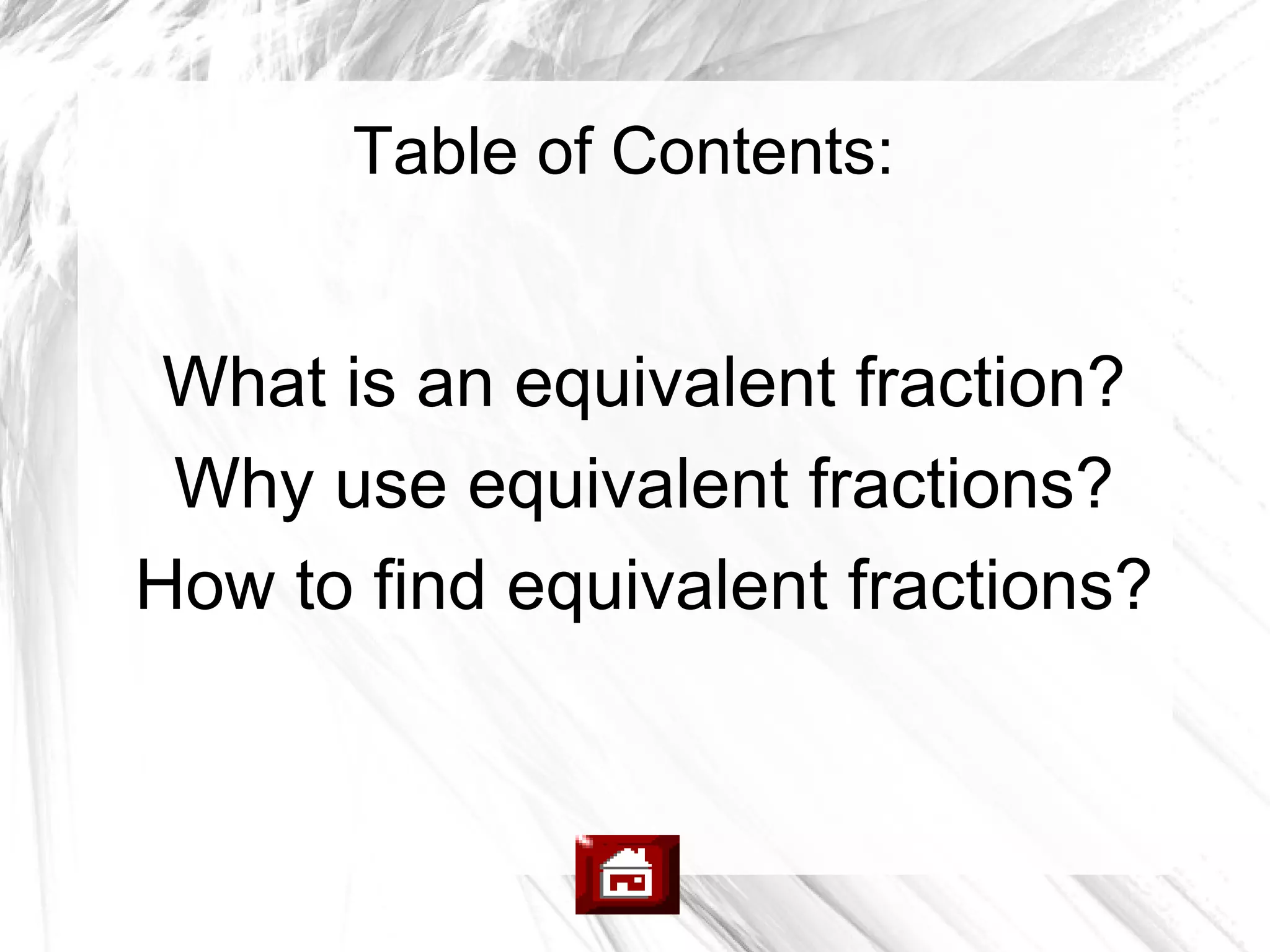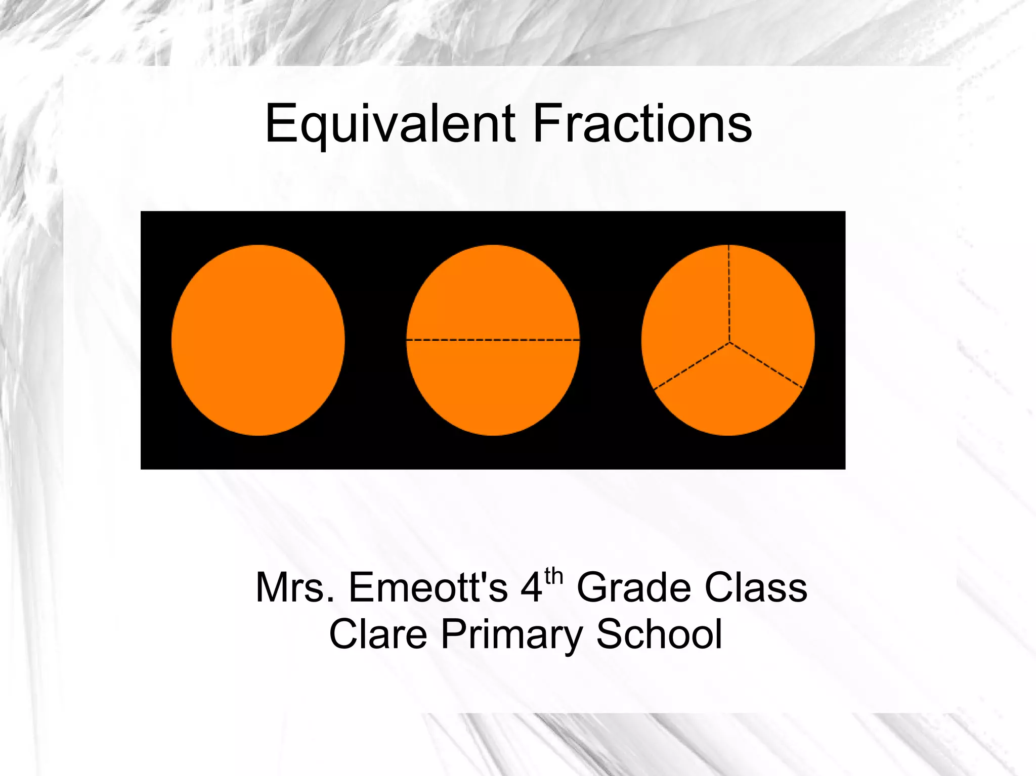 Equivalent fractions have different numerators and denominators but represent the same amount or portion. To find equivalent fractions, multiply the numerator and denominator by the same number. This makes fractions that are equal but with different representations. Using equivalent fractions makes working with larger numbers easier by expressing them as smaller equivalent fractions.