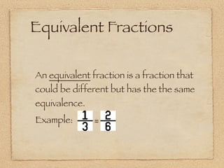 Fractions can be equivalent even if they look different, like 1/2 and 2/4, because they represent the same amount. Simplifying fractions makes them easier to understand by reducing the numerator and denominator by the same factor, such as reducing 6/12 to 1/2. Ordering fractions from least to greatest uses comparisons, where a fraction with a smaller numerator and denominator is less than one with a larger top and bottom numbers.