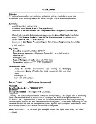 Ravi Kumar is seeking a position utilizing his skills in communication, programming, and creativity. He has experience in Linux system programming including device drivers, data compression, encryption, and networking. His projects involve character drivers, serial port drivers, parallel port drivers, and inter-process communication using pipes, FIFOs, shared memory and message queues. He is trained in C programming, shell scripting, and Linux system administration.