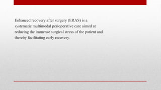 The document discusses Enhanced Recovery After Surgery (ERAS) protocols. It describes how ERAS aims to reduce surgical stress on patients through multimodal perioperative care, facilitating early recovery. This includes optimizations in pre-, intra-, and postoperative care such as shortened fasting times, carbohydrate loading, minimized fluid administration, and early mobilization. The document provides examples of procedures that can be done as day surgeries and details the key elements of ERAS protocols.