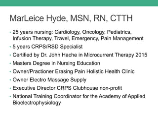 The document discusses microcurrent biofeedback neuromodulation and its role in bioelectronic medicine for healing. It explains how the body communicates through electrical signals and highlights microcurrent therapy's effectiveness in pain management and inflammation reduction by restoring cellular communication and promoting ATP production. Additionally, it covers chronic inflammation, its implications for health, and the benefits of specific frequencies in treating various conditions.