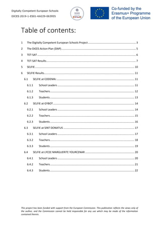 This document describes the Digitally Competent European Schools (DICES) project which involves four secondary schools from Belgium, Spain, France and Czech Republic. The project aims to analyze each school's current digital situation using tools like SELFIE and TET-SAT in order to develop action plans to improve digital competencies of students and teachers. Specific goals include implementing European digital frameworks in each school, increasing European dimension through cultural exchanges, and supporting teacher professional development. The project seeks to achieve an eTwinning quality seal for participating schools by 2022.