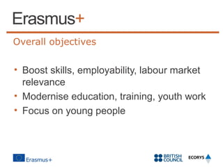 This document provides guidance on applying for funding under Key Action 2 of the Erasmus+ programme. Key Action 2 focuses on strategic partnerships and knowledge alliances to boost skills, employability, and modernize education and training. It simplifies the application process and provides over €940m for the UK over seven years. Eligible applicants include higher education institutions, vocational education organizations, schools, and others. Successful applications must address EU policy objectives, demonstrate quality partnerships, and have a clear plan for impact and dissemination of results. The deadline for the first round of applications is 30 April.