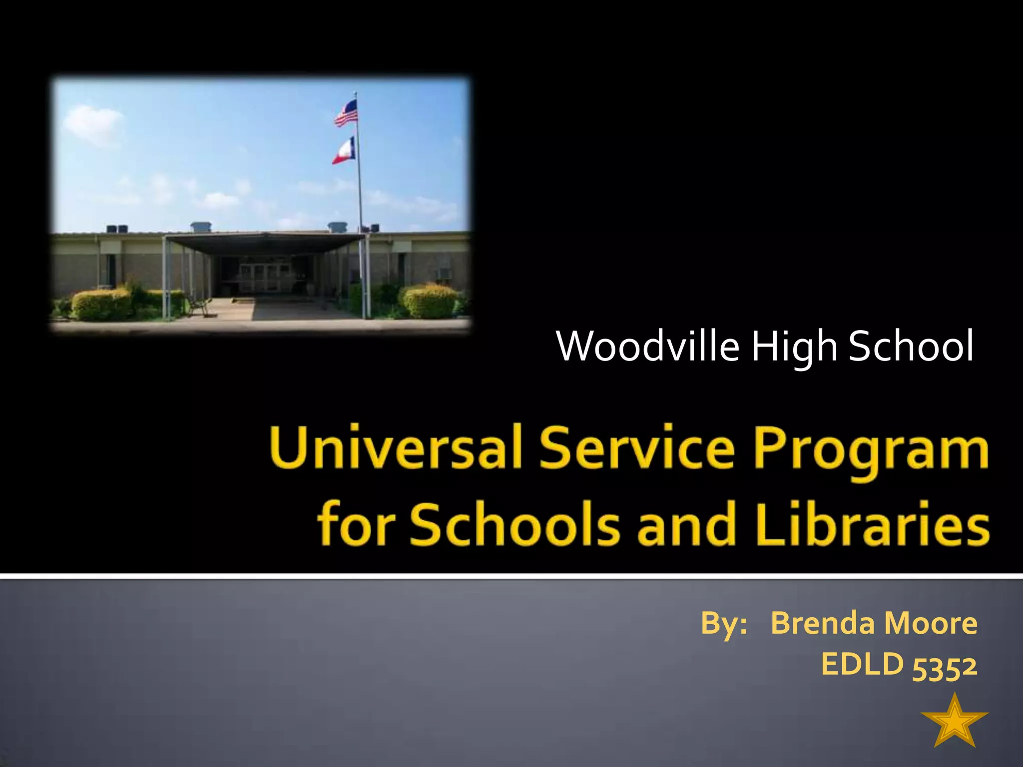This document discusses the E-Rate program, which provides discounts of 20-90% on telecommunication services for most schools and libraries in the US. It is funded by fees paid by telecommunications companies. The document outlines Woodville ISD's technology plan, which includes annually replacing PC/laptops and networking hardware, funding staff development, and ensuring a 1:1 student to computer ratio. The plan's objectives are to increase technology integration into instruction and provide opportunities for students to develop technology proficiency.