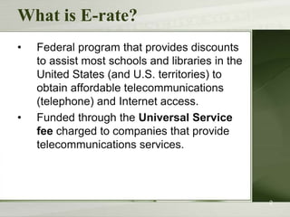 The document outlines the E-rate program, a federal initiative providing telecommunications and internet access discounts to eligible schools and libraries in the U.S., funded through a universal service fee. It details eligibility criteria, funding commitments, the application process including various forms, and the importance of compliance with regulations such as the Children's Internet Protection Act (CIPA). Additionally, it explains the competitive bidding process for securing services and calculates potential discounts based on specific criteria.