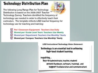 The document summarizes information about the E-Rate program, which provides discounts of 20-90% on telecommunications services, internet access, internal connections, and basic maintenance for most schools and libraries in the US. It outlines the services that are eligible for funding, how discount levels are determined based on poverty and location, and the multi-step application and funding process. It also provides details about the technology plan requirements for schools to receive E-Rate funding and describes Leander Independent School District's technology mission and plans to integrate instructional technology into the curriculum at different grade levels.