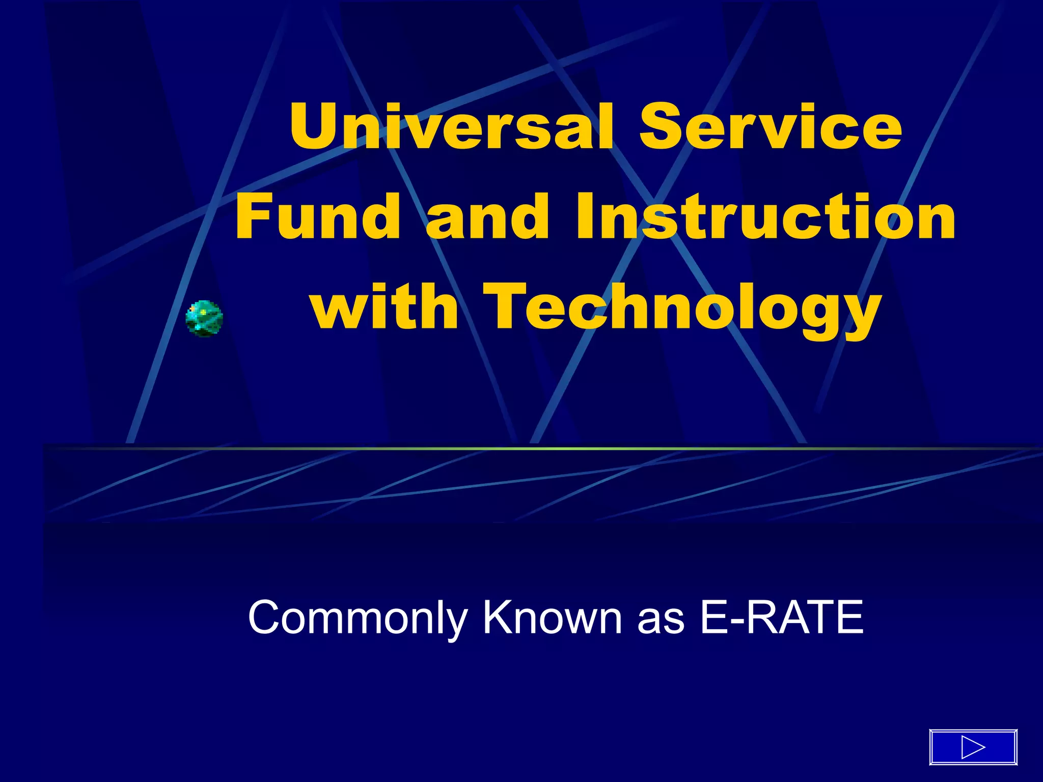 The document discusses the E-RATE program, which provides discounts to schools and libraries to obtain affordable internet access and telecommunications. It is funded by a fee charged to telecom companies. Schools must have an approved technology plan and follow application steps to receive funding. The district has a high percentage of economically disadvantaged students and relies on E-RATE to support its technology infrastructure. The campus works to meet the technology plan requirements and incorporate technology into lessons at least weekly to take advantage of the E-RATE funding and support 21st century learning.