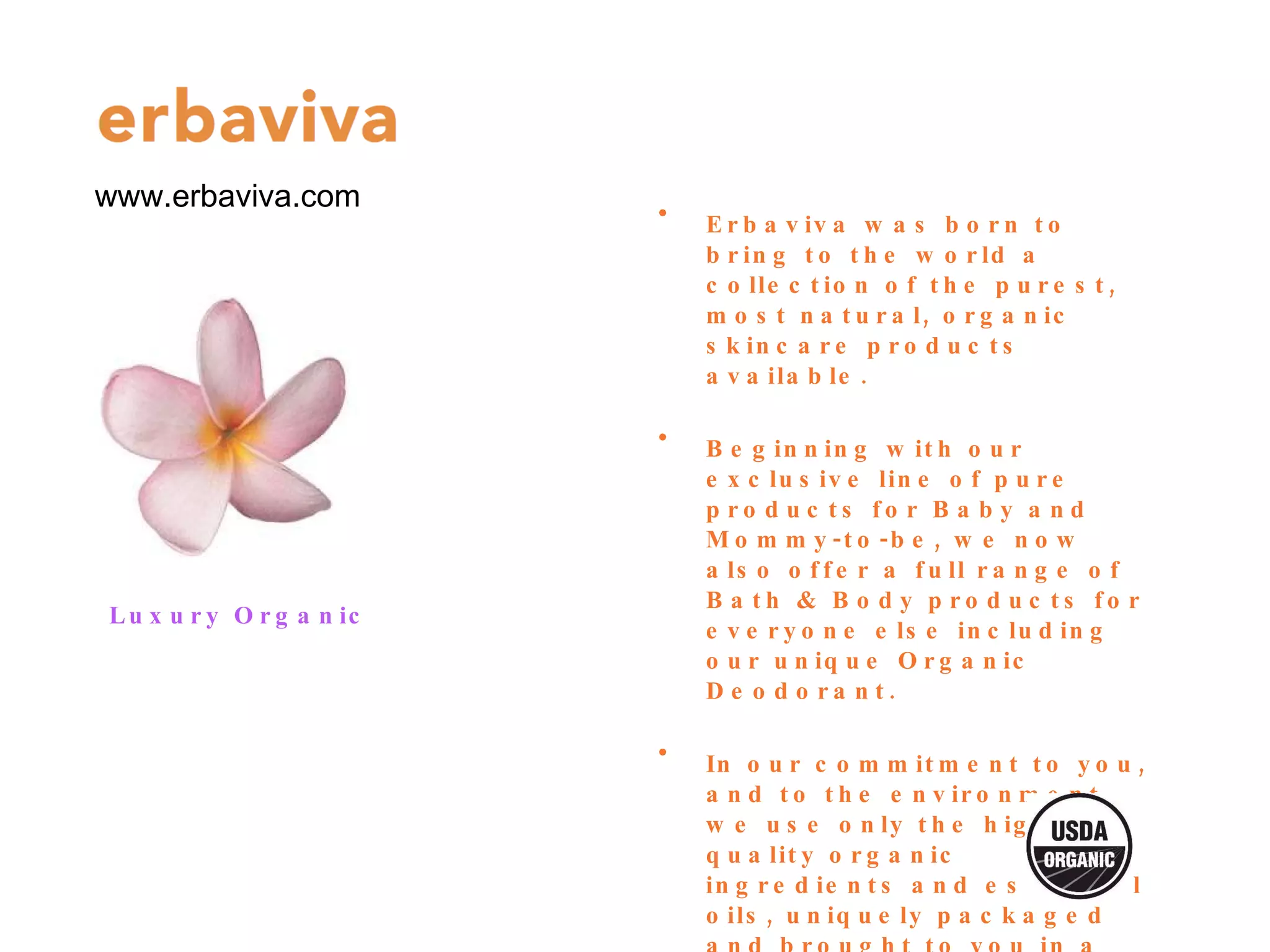 Erbaviva is an organic skincare company founded in 1996 that offers products for babies, mothers-to-be, and adults, including deodorant, bath, and body products. The company uses only the highest quality organic ingredients and essential oils. Erbaviva supports social and environmental causes and adheres to stringent USDA organic standards.