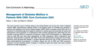 This document provides guidance on managing diabetes in patients with chronic kidney disease. It discusses epidemiology and the importance of glycemic control in slowing kidney disease progression. A case study is presented of a 65-year-old man with type 2 diabetes and stage 3 CKD, and appropriate HbA1c goals and measurement considerations are reviewed. Options for antihyperglycemic agents in CKD, including risks and benefits, are covered. Acute kidney injury is defined as a sudden reduction in renal function.