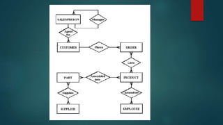 The document describes an entity relationship diagram (ERD) for tracking product and component information for a manufacturing company. It lists the key entities as products, components, suppliers, and their attributes and relationships. Products are made up of multiple components, each component can have one or more suppliers, and the ERD shows the one-to-many relationships between these entities.