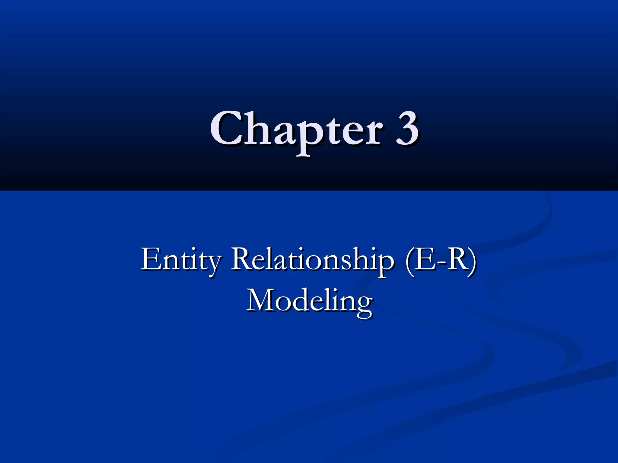 This chapter discusses entity relationship (E-R) modeling and its purpose in database design. It covers the key components of E-R modeling including entities, attributes, relationships and how they are defined and refined. The chapter also explains conceptual, internal and external data models and how E-R diagrams represent the conceptual view through entities, attributes, and relationships. Generalization hierarchies and the iterative process for developing E-R diagrams are also summarized.