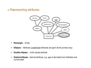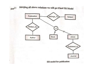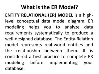 The document discusses the Entity Relationship (ER) model and ER diagrams. The ER model is a conceptual data modeling technique that is used to produce a database design. It displays entities, attributes, and relationships between entities. ER diagrams help visualize these components and the logical structure of databases. Some key benefits of ER diagrams include defining database terms, providing a preview of how tables connect, and allowing communication of the database structure. Common components of ER diagrams are entities, attributes, and relationships.