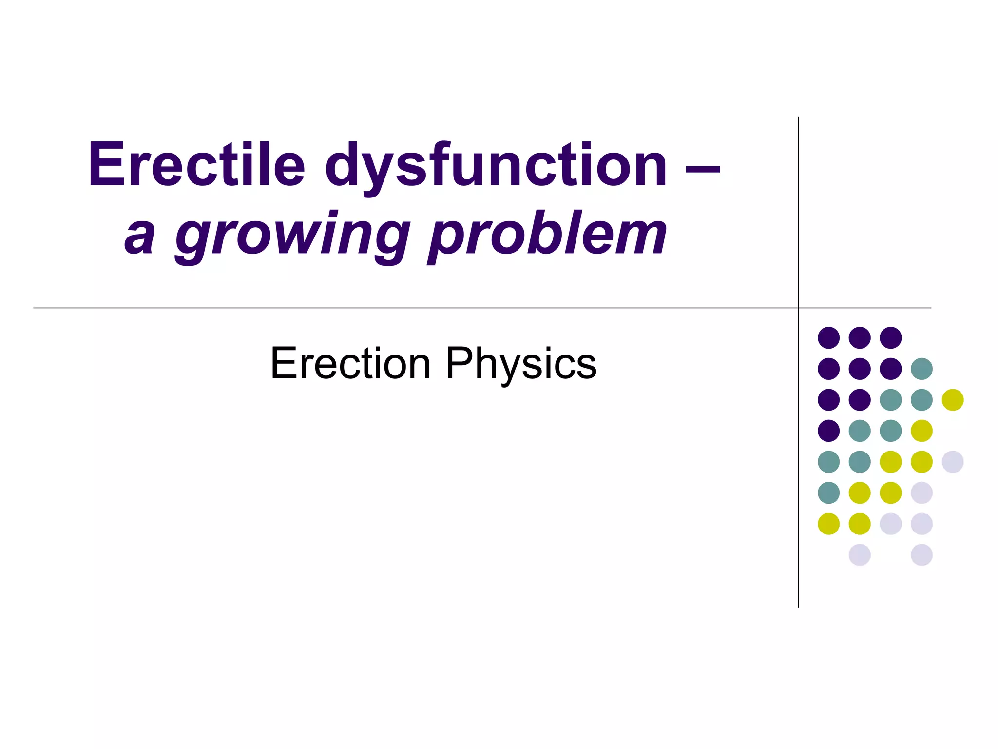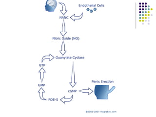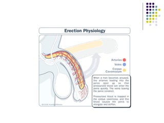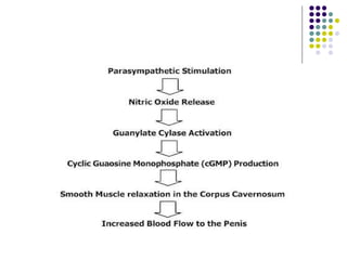 Erectile dysfunction is a growing problem that affects over 150 million men worldwide. It is caused by various vascular, neurological, endocrine, psychological, and pharmacological factors that can impair blood flow or nerve signaling in the penis. Common medical treatments include phosphodiesterase type 5 inhibitors like sildenafil (Viagra), which help maintain blood flow; penile injections; vacuum devices; testosterone replacement therapy; and penile implants. Counseling may also help address psychological aspects.