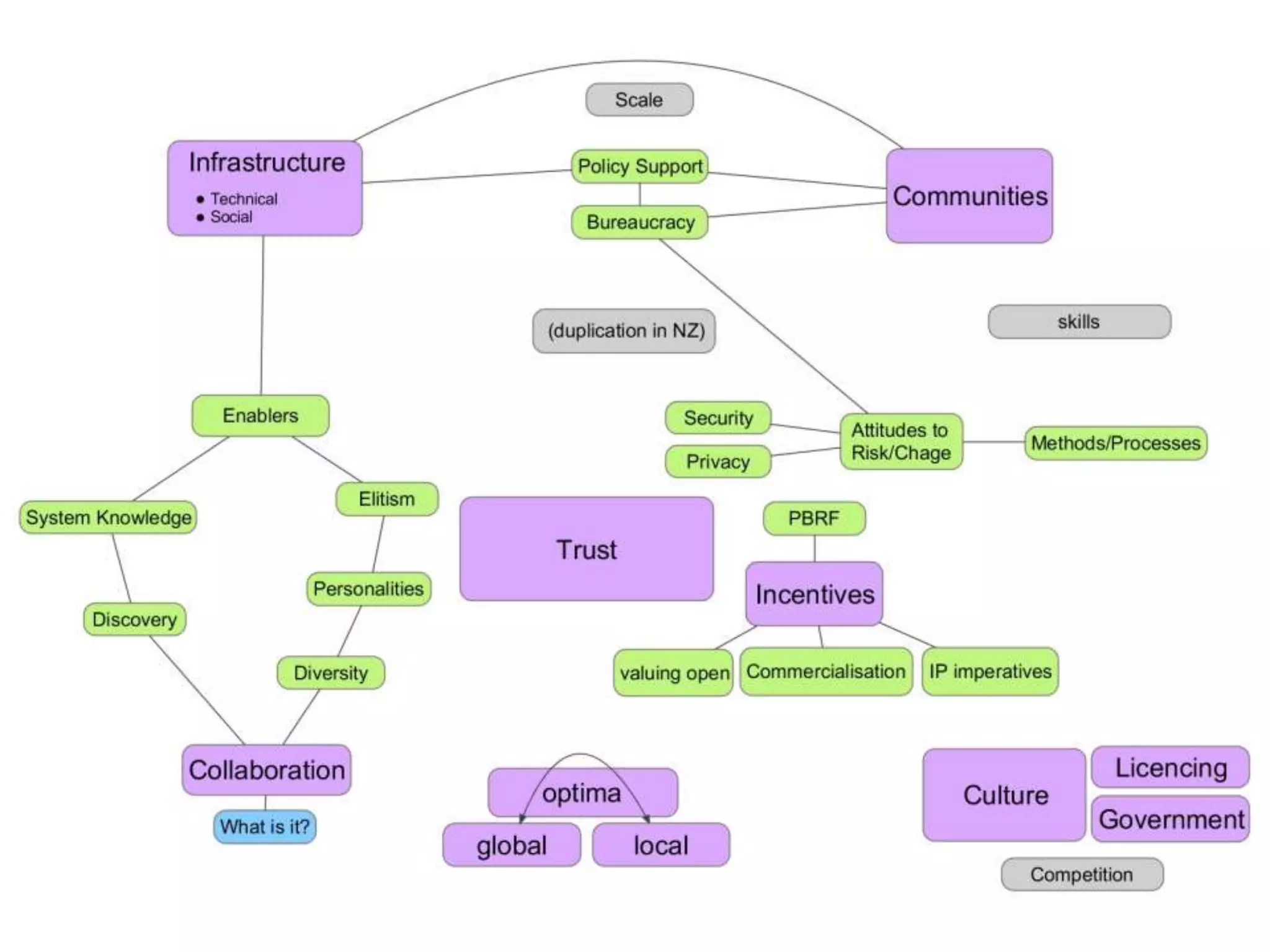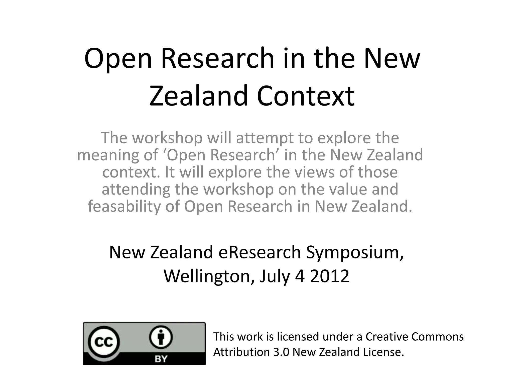 The document discusses a workshop held in New Zealand to explore the meaning and feasibility of open research in the country's context. It explores views on the value of open research and how to implement related principles through actionable tasks. Challenges identified include infrastructure support, cultural shifts, incentives, and collaboration between different stakeholders. Specific near-term actions proposed are building researcher networks, identifying advocates, raising awareness through events and social media, and developing a document on open research for relevant stakeholders.