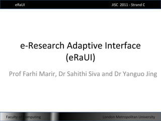 This document discusses the eRaUI project which aims to develop a personalized and adaptive user interface for text mining e-research tools. The objectives are to identify different types of users, implement filtering algorithms to extract relevant digital content, design an adaptive UI with workflow capabilities to support different user groups and activities, use visualization techniques for navigation and information display, and integrate the interface with the NaCTeM tools. The anticipated outputs are an adaptable and learnable interface called eRaUI that improves usability of NaCTeM resources, a project blog, and a final report describing the approach and lessons learned.