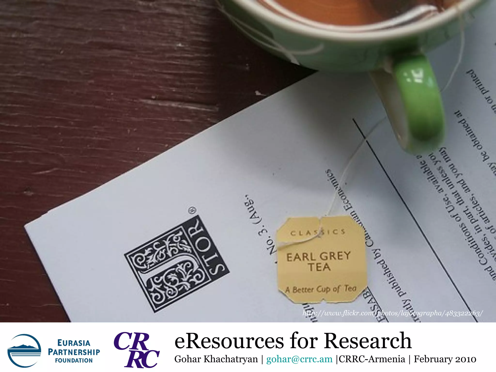 This document provides a summary of various eResources that can be used for research, including scholarly databases, survey reports and datasets, and useful links. It describes several databases like JSTOR, Project Muse, World Development Indicators, and EbscoHost that provide access to academic journals, publications, and statistics. It also lists survey datasets from the CRRC Data Initiative and other organizations on topics like corruption, labor migration, and demography in Armenia. Finally, it provides links to resources on research methodology.