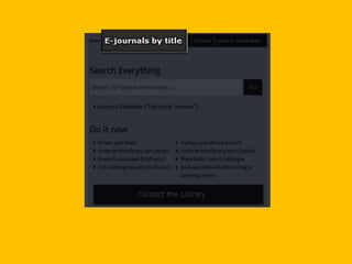 This document provides guidance for helping students with questions about accessing electronic resources. It outlines four main steps: 1) Find out what resource the student wants and note details like title and author; 2) Determine how the student is trying to access it and if they are on or off campus; 3) Try accessing the resource yourself; 4) Use library search tools to check if the resource is available and troubleshoot issues like broken links, reporting problems to the appropriate team. The goal is to help students directly when possible and determine when to pass them to other specialists.