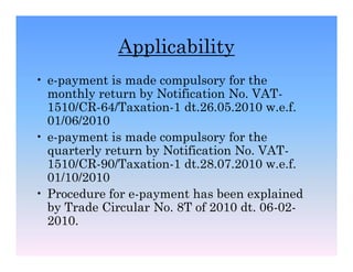 This document provides information and instructions for e-payment of VAT in India. It explains that e-payment is now mandatory for monthly and quarterly VAT returns. It outlines the procedure for e-payment through banks integrated with the MSTD website or directly from individual bank websites. Specific banks that allow direct e-payment are listed. Steps for e-filing of VAT returns through the MVAT website are also provided, including downloading and preparing the return form, uploading the completed form, and obtaining an acknowledgment.