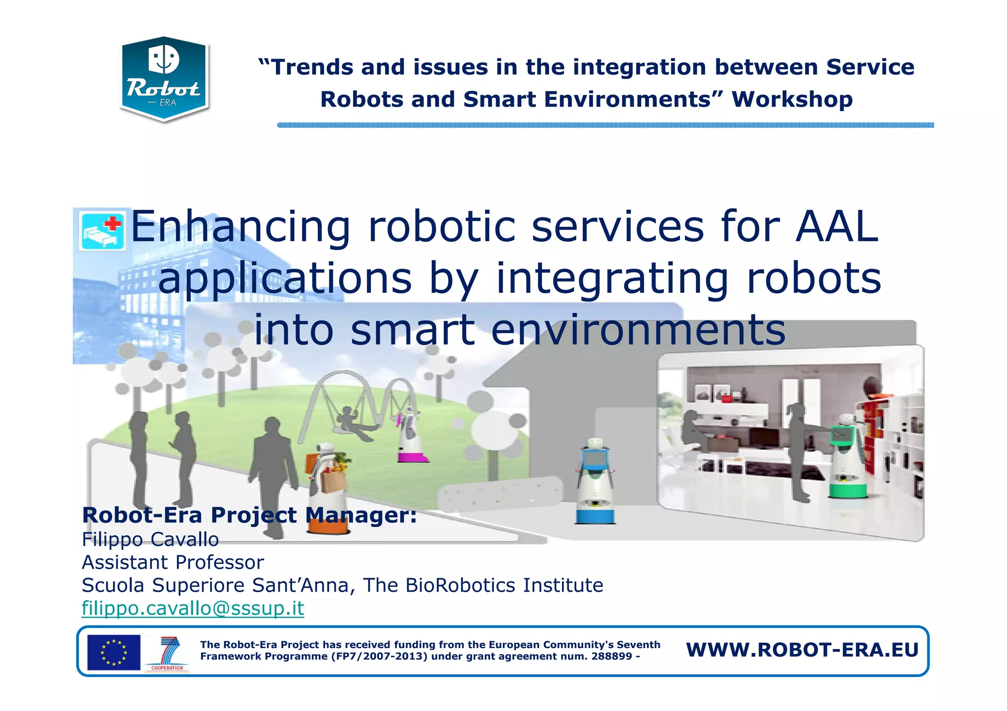 The document discusses the Robot-Era project which aims to develop and demonstrate advanced robotic services integrated into smart environments to provide independent living assistance for elderly people. The project involves different robots cooperating with each other and being coordinated by a configuration module. One of the services tested was a shopping delivery service where an elderly user created a shopping list using a GUI or speech and received their items delivered by a robot. Localization of users was performed using a Kalman filter fusing data from wearable sensors and presence sensors.