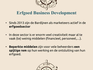 de Bardijnen willen via het project "Erfgoed Business Development" de brug slaan tussen de merkmarketing en erfgoedmarketing om zo erfgoedlocaties te helpen bij de financiering van hun werking en promotie. Lees er meer over op www.debardijnen.be