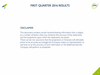 In the first quarter of 2016, ERG reported solid financial results. Total installed capacity increased to 1,720 MW due to acquisitions. Adjusted EBITDA was €163 million, up from €111 million in the first quarter of 2015. Guidance for 2016 was confirmed with adjusted EBITDA of €400 million, CAPEX of €440 million, and adjusted net financial position of €1.73 billion.