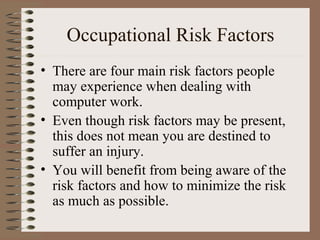 This document discusses occupational risk factors for computer work including repetition, forceful exertions, awkward postures, and contact stress. It provides tips for minimizing these risks such as taking regular breaks from repetitive tasks, using light touches when typing, arranging workspaces ergonomically, and using proper posture. Maintaining neutral wrist and arm positions and avoiding prolonged awkward postures can help reduce muscle and joint strain.