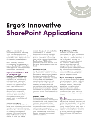Ergo is an IT consulting firm that provides SharePoint consulting, software solutions, and infrastructure services. They have developed innovative applications built on the SharePoint 2010 platform to help organizations address business needs and drive value. These include solutions for business process management, business intelligence, document services, business forms, and project management. Ergo can help automate processes like leave requests and streamline operations using SharePoint. As a Microsoft Gold Partner, they have expertise implementing and customizing SharePoint solutions.