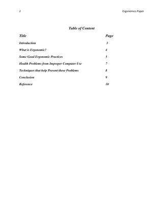 This document defines ergonomics and discusses good ergonomic practices when using computers to prevent health issues. It defines ergonomics as applying scientific principles to maximize comfort and efficiency in the workplace. Some good ergonomic practices discussed include adjusting chairs, monitors, keyboards and mice to align the body in a straight, comfortable position. Improper computer use can cause issues like eyestrain, back pain, wrist injuries. Taking regular breaks and properly setting up equipment can help prevent these problems.