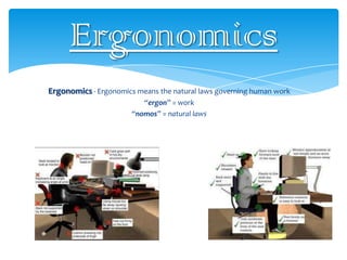 This document summarizes an ergonomics project report. It defines ergonomics as the study of natural laws governing human work. The report discusses how ergonomics can enhance safety, reduce fatigue and stress, and improve employee morale and quality. It analyzes specific tasks at a car manufacturing plant and identifies ergonomic issues like repetitive motions, forceful exertions, and awkward postures. The report describes improvements made like adjustable workstations and material reorganization. It evaluates tasks using the REBA method to assess risk levels. Overall, the report shows how ergonomic changes can benefit workers through reduced injuries, illness, and costs while improving productivity.