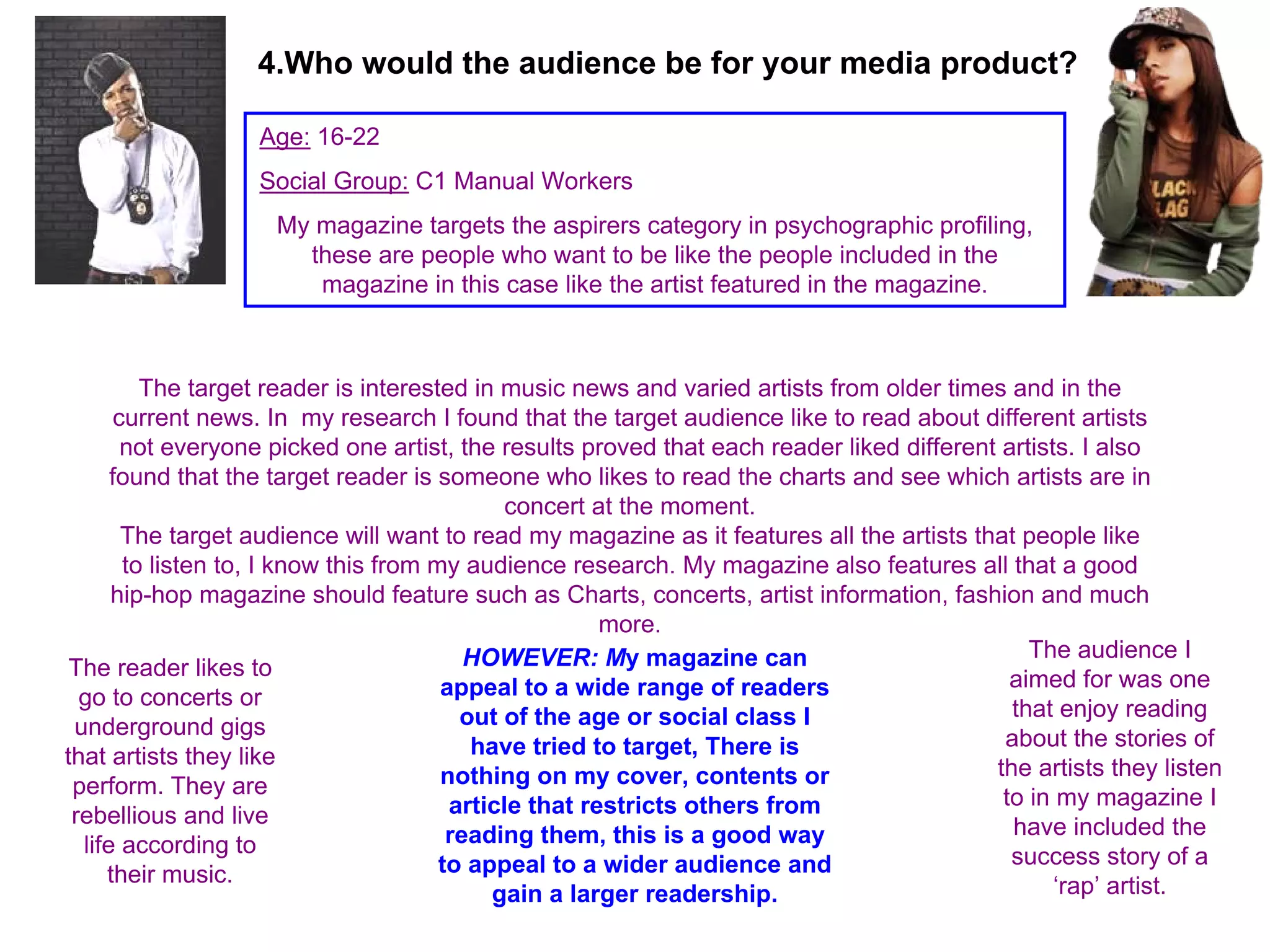 The target reader for the magazine is ages 16-22, who enjoy reading about various artists from both past and present. They like to keep up with music news and charts, as well as information about upcoming concerts. The reader enjoys underground music genres and going to live shows. To attract this audience, the magazine cover features a current hip hop artist in headphones, and the contents include a mix of images and text about both established and new artists that the target reader listens to.
