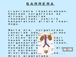 Liseriketa ikasterakoan, hesteakxurgartzen ez dituen janariak (hondakinak) uzkitik kanporatzen direla ikasi dugu. Baita ere, xurgatutako janariak odolaren bidez zelula guztietara iristen direla. Janari hauek energia sortzeko oxigenoarekin elkarzean, era ezberdinetako hondakinak sortzen dira: ura karbono-dioxidoa,gatzak,urea... Orain aipatutako hondakin horiek, izerdia,gernua eta arnasa botatzean kanporatzen dira. SARRERA