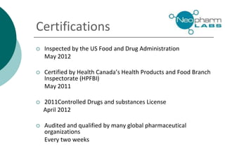 Neopharm Labs provides analytical testing services including chemistry, microbiology, sterility testing, and method development and validation to the pharmaceutical, biotech, cosmetic, and veterinary industries. It has over 110 employees and 32,000 square feet of facilities in Quebec, Canada. Neopharm is certified by the FDA and Health Canada and audited by global pharmaceutical companies. It has a wide range of instrumentation and offers services such as dissolution testing, stability studies, and microbiological assays.