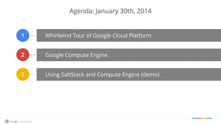 The document outlines a technical program agenda led by Eric Johnson on using SaltStack with Google Compute Engine, detailing Google Cloud Platform's capabilities and features. It highlights the architecture, virtual machine types, networking options, and the use of SaltStack for automation within Google's cloud infrastructure. The presentation also includes a demo of setting up SaltStack instances in the Google Cloud environment and managing them effectively.