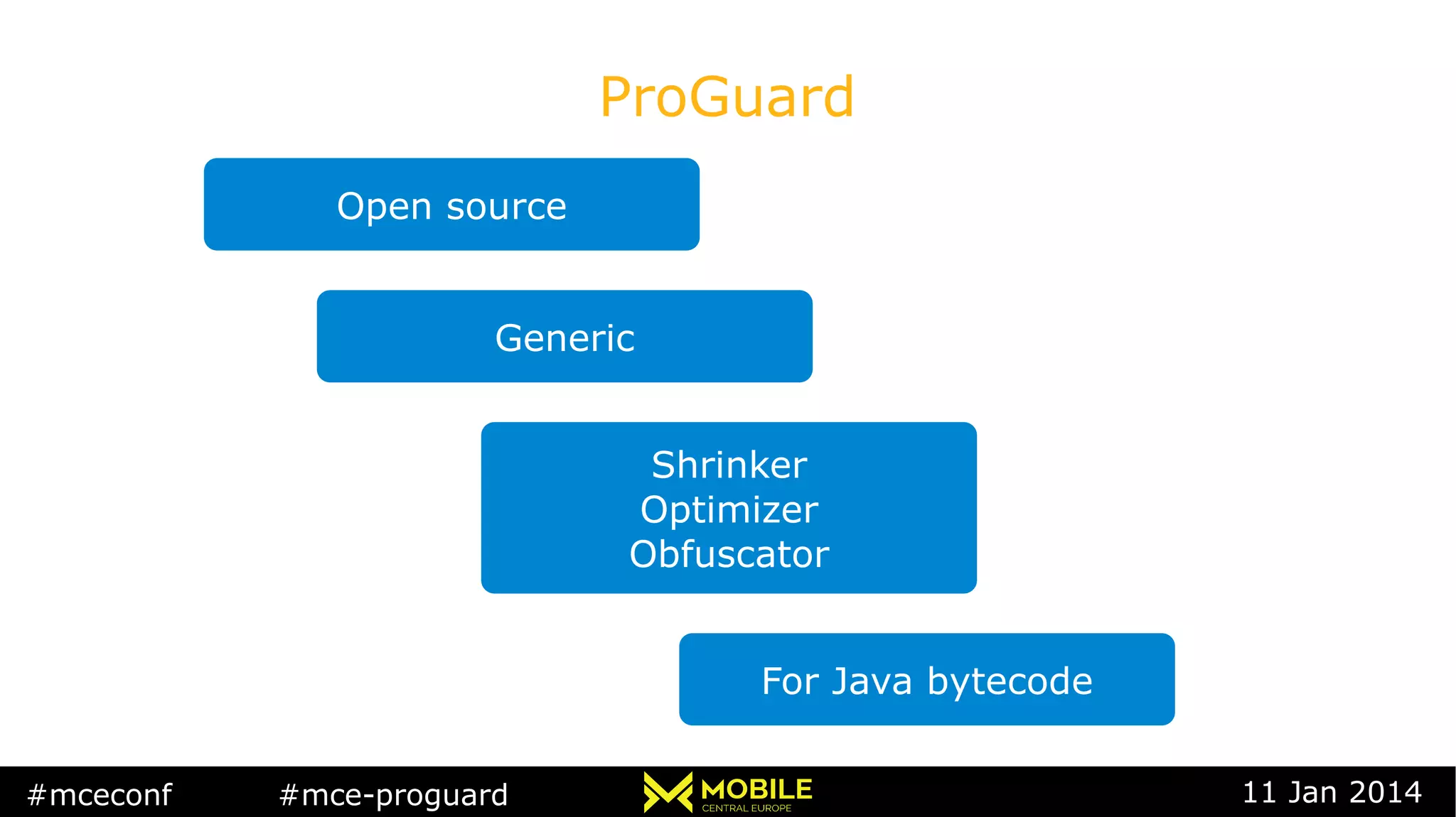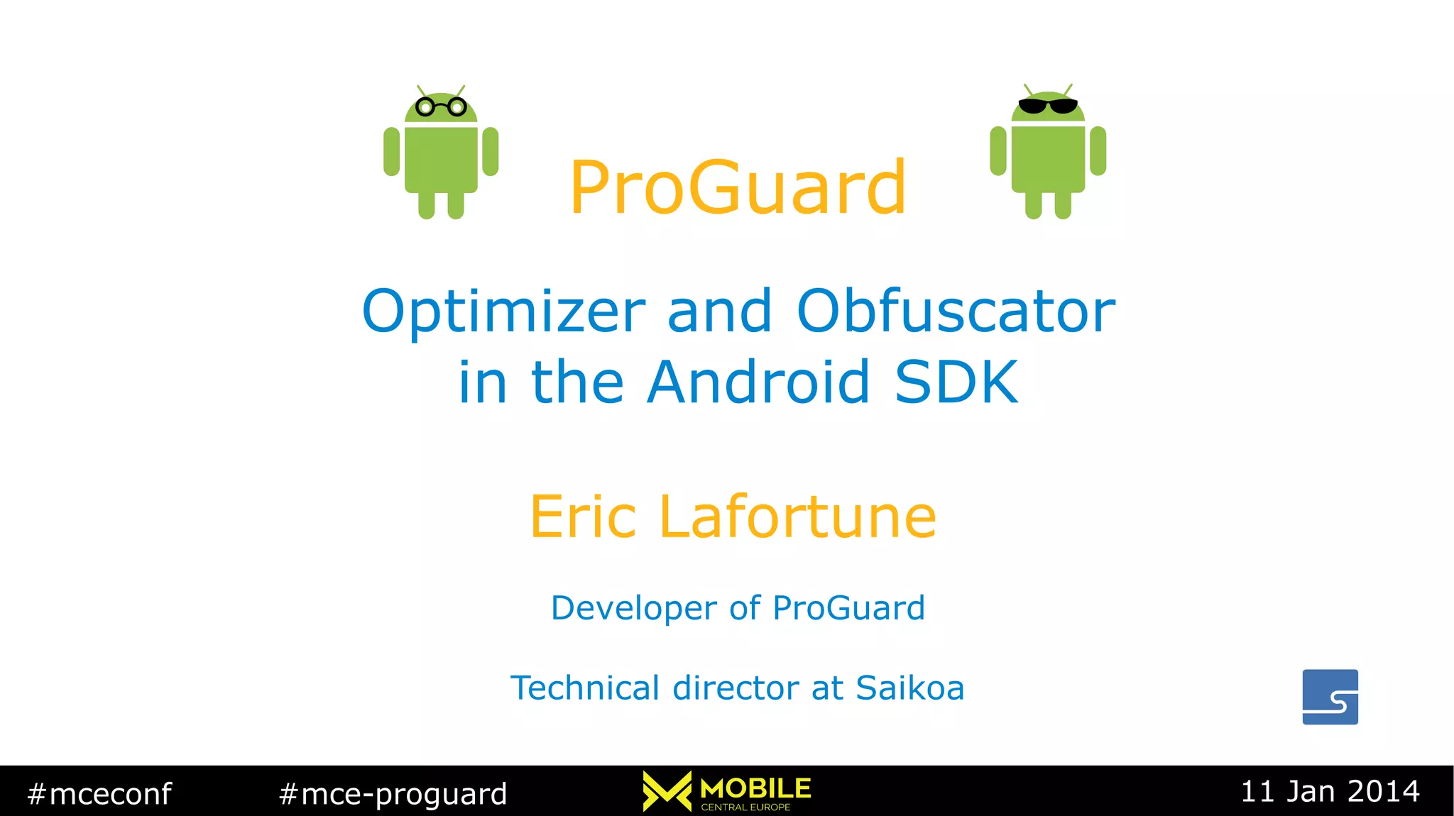 This document summarizes the presentation on ProGuard by Eric Lafortune at the #mceconf conference on January 11, 2014. ProGuard is an optimizer and obfuscator tool included in the Android SDK. It shrinks, optimizes, and obfuscates Android applications bytecode. Using ProGuard can significantly reduce application sizes and improve performance. It removes unused code, performs optimizations at the bytecode level, and obfuscates the code to make reverse engineering more difficult. The document provides examples of how ProGuard can reduce application sizes by 20-90%, improve performance by up to 20%, and demonstrates optimizations like inlining, constant propagation, and enum handling. It also explains how to configure and enable ProGuard in Android builds
