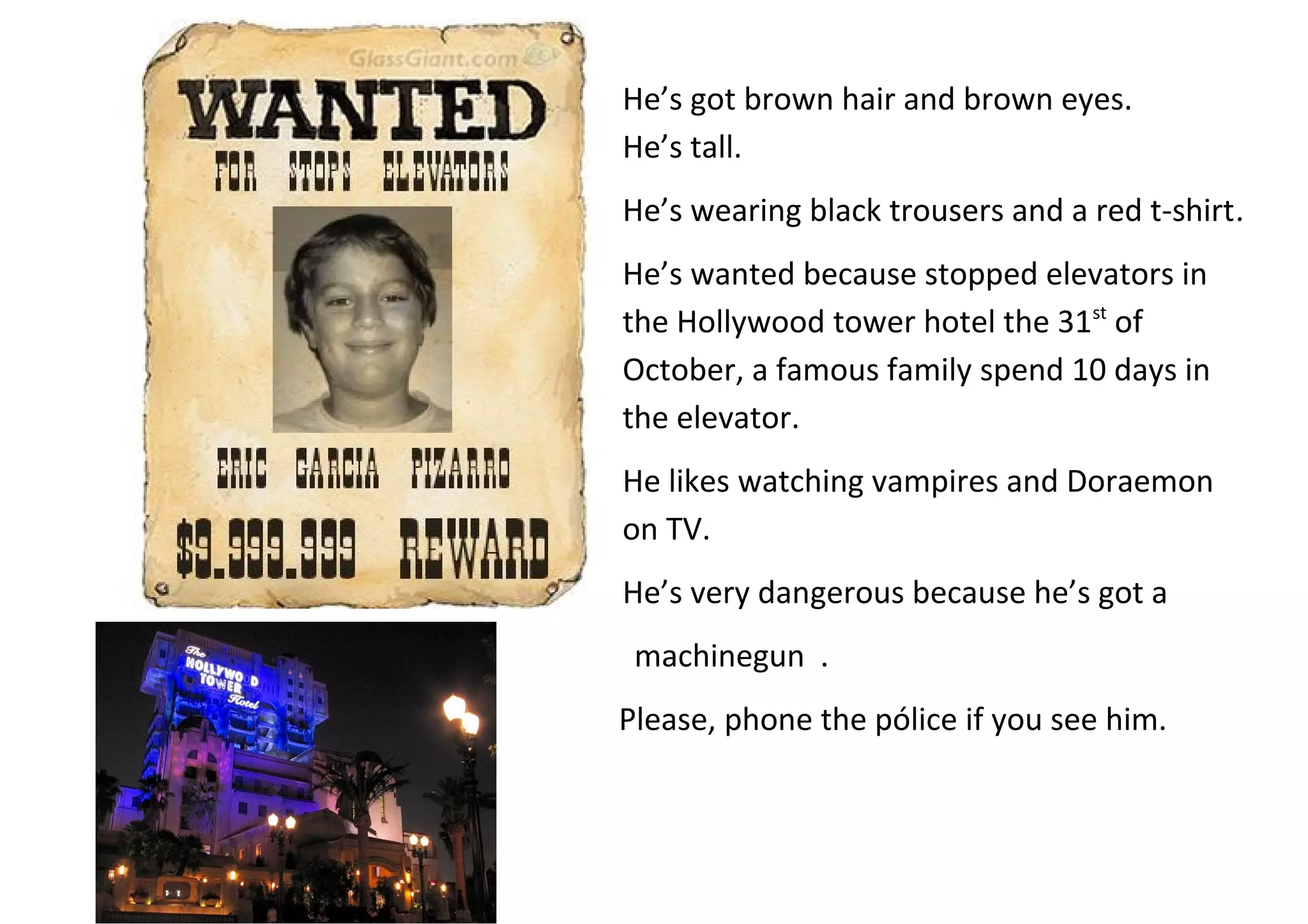 A man with brown hair, brown eyes, who is tall, wearing black trousers and a red t-shirt is wanted by police for stopping elevators in the Hollywood tower hotel on October 31st, trapping a famous family inside for 10 days. He enjoys watching vampires and Doraemon on TV and is considered very dangerous because he has a machine gun.