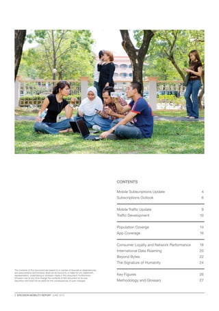 The June 2013 Ericsson Mobility Report highlights a global growth of mobile subscriptions, with an 8% increase year-on-year and mobile broadband subscriptions surging by 45% to approximately 1.7 billion. Significant data traffic growth is noted, with the amount of mobile data traffic doubling from Q1 2012 to Q1 2013, largely driven by the rising adoption of smartphones and LTE technology. The report also discusses trends in mobile technology, consumer loyalty linked to network performance, and emerging opportunities for operators in international data roaming.