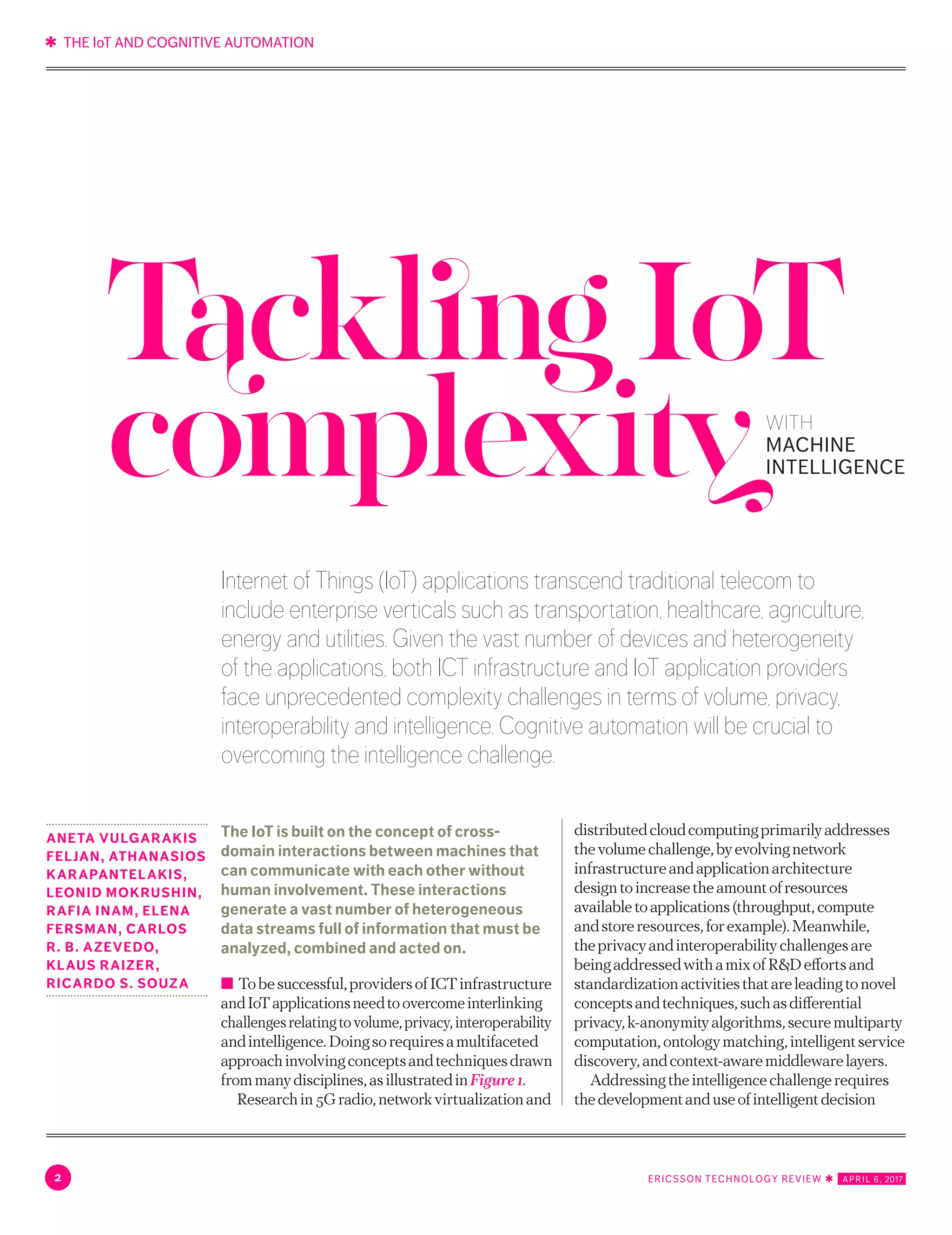 The document discusses the role of cognitive automation as an enabler for Internet of Things (IoT) applications across various sectors, highlighting the challenges of volume, privacy, interoperability, and intelligence. It outlines Ericsson's cognitive automation framework designed to support Intelligent Decision Support Systems (DSS), which improve the efficiency of IoT systems by facilitating decision-making through machine intelligence. The framework has practical applications in areas such as transportation logistics, smart metering, and automated testing, all aimed at reducing operational costs and development time.