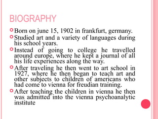 Erik Erikson was a German-American developmental psychologist known for his theory of psychosocial development. The theory describes 8 stages of human development across the lifespan. Each stage presents a psychosocial crisis that must be resolved through how one relates to others. Successful resolution leads to a healthy personality and the acquisition of basic virtues or strengths. Erikson made important contributions in applying psychoanalytic ideas to social and cultural influences on development.
