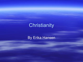 Christianity originated from the teachings of Jesus Christ. Key beliefs include that Jesus was the son of God, was resurrected after being crucified, and sacrificed himself to save humanity from sin. The Christian Bible consists of the Old and New Testaments. Symbols of Christianity include the ichthys symbol, the Holy Trinity, and the Alpha and Omega symbols. Churches share common features like crosses but vary in style, size, and traditions. Rites of passage include communion, baptism, and confirmation. Major holidays are Lent, Easter, Christmas, and Holy Week. Christianity spread rapidly after Jesus' death and Paul's missionary work, becoming the world's largest religion by the 4th century CE.