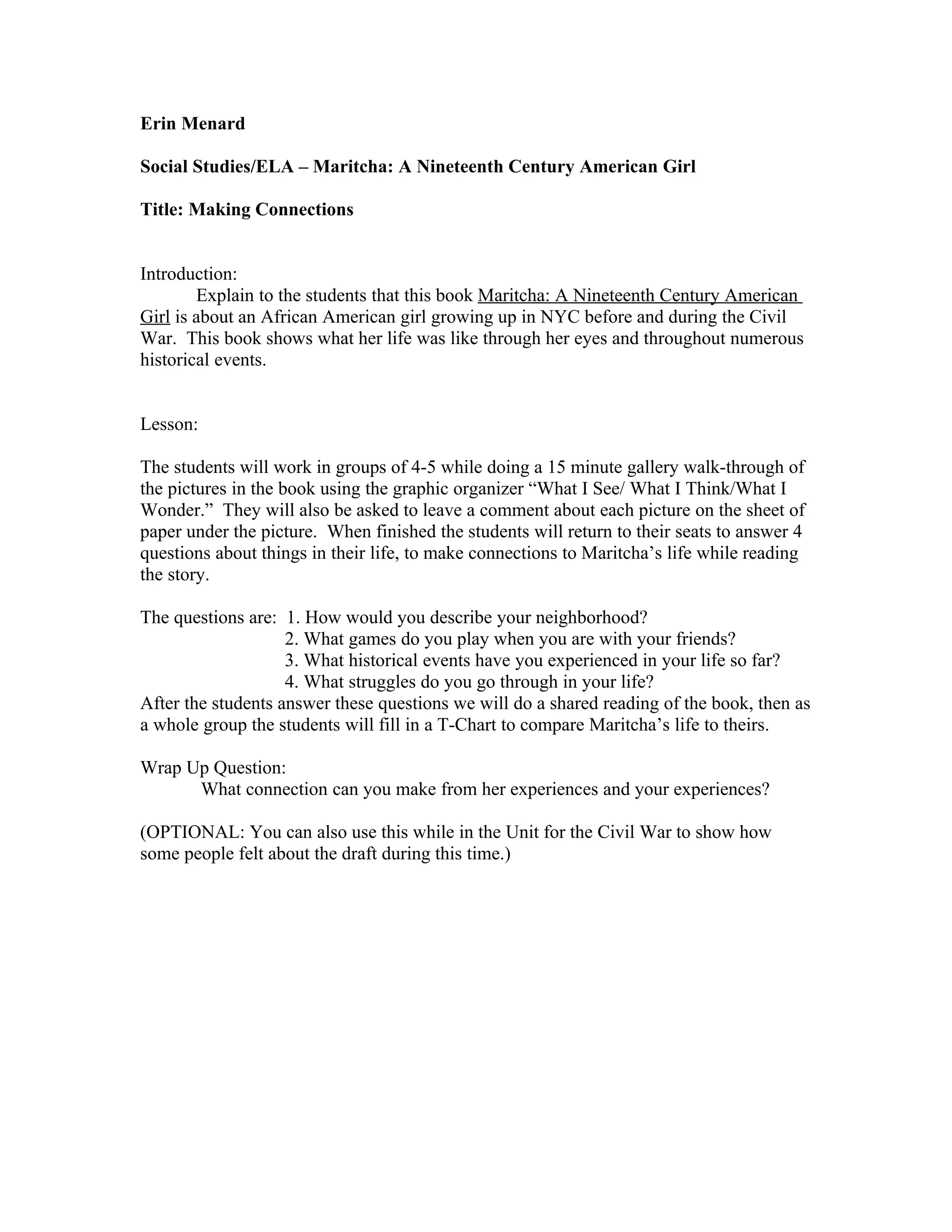 The document describes a lesson plan for teaching students about the book "Maritcha: A Nineteenth Century American Girl". Students will work in groups doing a gallery walk of pictures from the book, leaving comments. They will then answer questions to draw connections between Maritcha's life and their own lives. Finally, the class will do a shared reading and fill out a T-chart comparing Maritcha's and their lives. The lesson aims to give students insight into what life was like for an African American girl in 19th century New York.