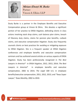 This document provides biographies of several speakers at an ERISA litigation conference. It summarizes their professional experiences working on ERISA litigation cases and providing counsel to fiduciaries. Some key points discussed include best practices for fiduciaries to avoid ERISA lawsuits, such as providing training and separating protected from unprotected communications. It also emphasizes the importance of understanding multiemployer plan liabilities and withdrawal rules to avoid issues.